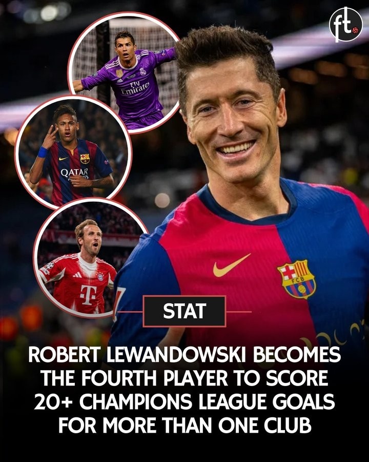 统计报名,莱万多夫斯基成为历史上第四位为两家俱乐部打进20+欧冠进球的球员,另外三位达此成就的球员是凯恩(热刺、拜仁)、C罗(曼联、皇马)和内马尔(巴萨、巴黎)。